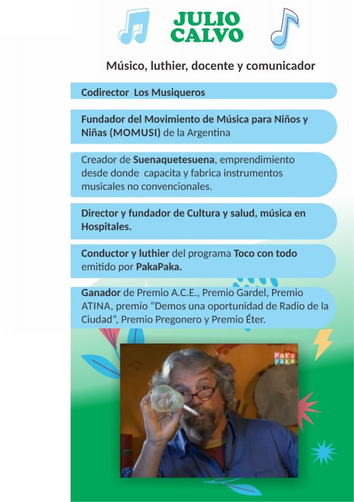 El taller estará a cargo del músico, luthier, docente y comunicador Julio Calvo, ex-miembro de la banda infantil “Los Musiqueros” con más de 30 años arriba de los escenarios, también fue fundador del Momusi, entidad que agrupa a todos los músicos dedicados a las infancias fundado en 1985. Calvo también fue conductor de “Toco con todo” programa emitido por el canal PAKAPAKA.