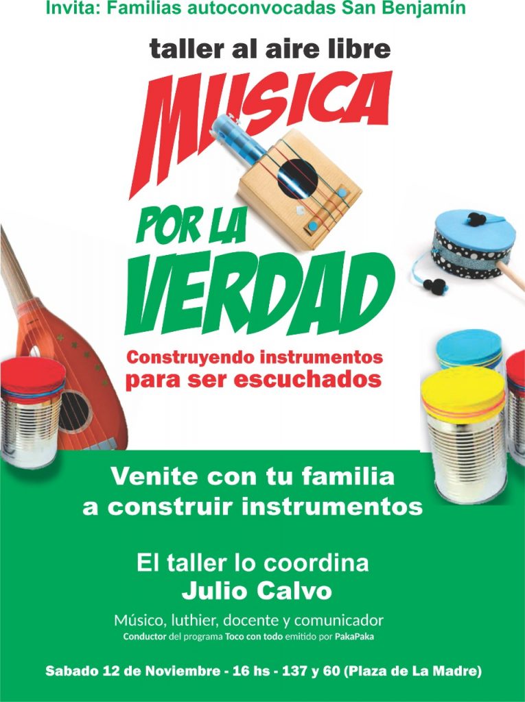 Las “Familias autoconvocadas de San Benjamín” invitan a toda la comunidad, en especial a niños y niñas, a participar del taller de construcción de instrumentos musicales denominado “Música por la verdad “, en apoyo a las docentes del jardín y al profesor de música Lucas Puig.