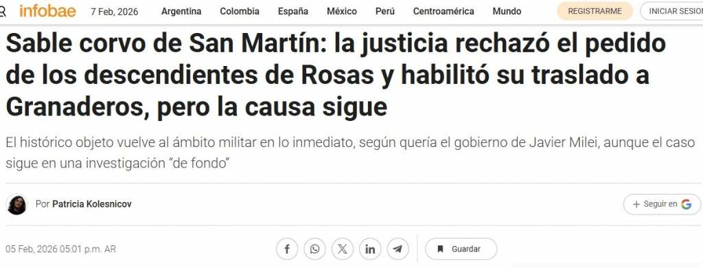 Cómo se sabe el General Don José de San Martín obsequió su sable al Brigadier y gobernador de la Provincia de Buenos Aires Don Juan Manuel de Rosas, luego de la Batalla de la Vuelta de Obligado, como reconocimiento a su defensa del interés nacional, a pesar de los conflictos internos del país en el camino hacia su consolidación como estado nación. Por eso el sable y la historia sanmartiniana, como las luchas independentistas, son reivindicadas y con razón por los sectores nacionalistas argentinos. La trilogía San Martín-Rosas-Perón por ejemplo lo prueba.